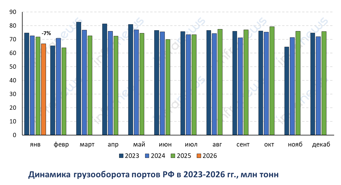 Грузооборот портов России в январе 2026 года сократился на 7%