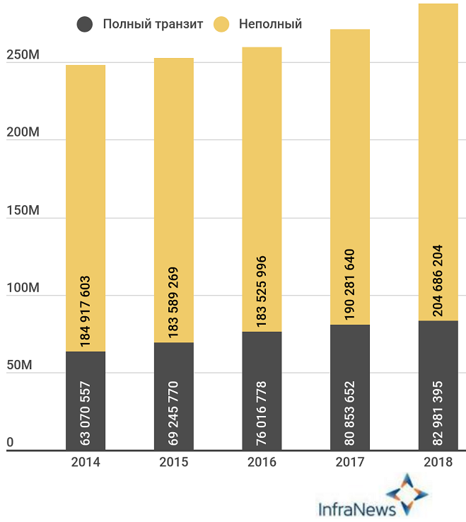 С запада на восток частично или полностью прошло 141 млн.т. (рост к 2017г – 5,45%, к 2014г – 14,9%). С востока на запад частично или полностью прошло 56,9 млн.т. (+10,1% за год, +24,5% за 5 лет). Возникло и погасилось внутри 89,7 млн.т. (+4,7% к прошлому году, +12,8% за 5 лет.)