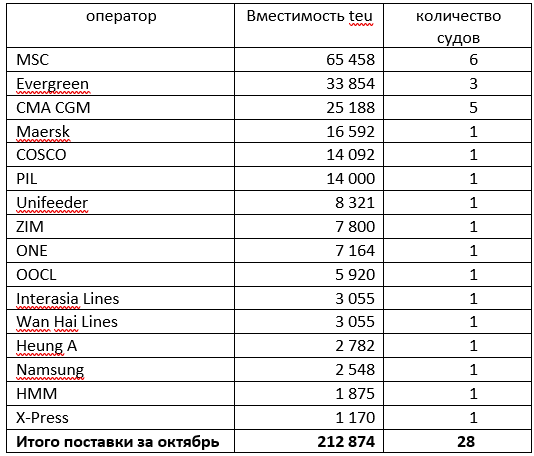 MSC вновь лидер: на оператора пришлась почти треть всех октябрьских поставок по совокупной вместимости и примерно 1/5 по числу судов. Всего швейцарско-итальянская группа получила 6 судов, в том числе три 16-тысячника. На втором месте по числу судов CMA CGM c 5 новыми поставками вместимостью от 8 до 2 тыс. TEU. По вместимости поставленного флота второе место занимает Evergreen, флот которого пополнился в прошлом месяце двумя 15-тысячниками.